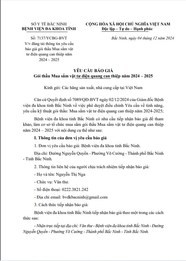 Yêu cầu báo giá Gói thầu Mua sắm vật tư điện quang can thiệp năm 2024 – 2025