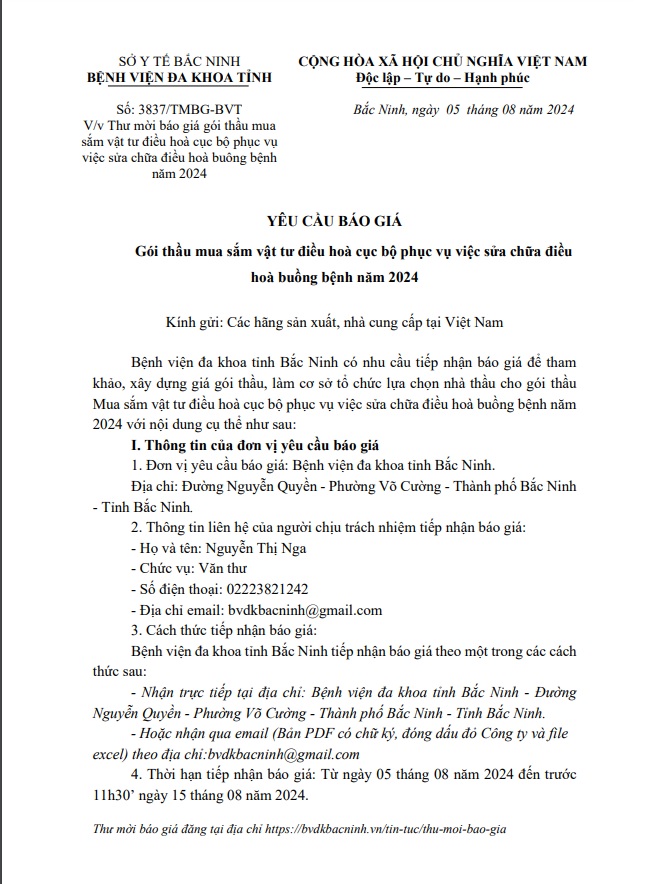 Yêu cầu báo giá gói thầu mua sắm vật tư điều hoà cục bộ phục vụ việc sửa chữa điều hoà buồng bệnh năm 2024