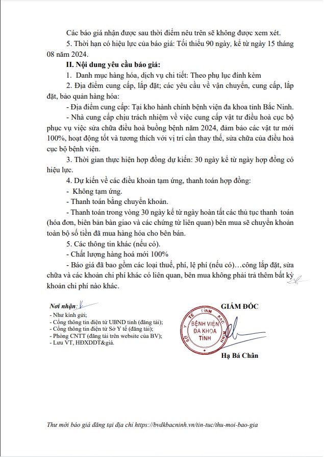 Thư mời báo phí thẩm định giá Gói thầu: Dịch vụ bảo dưỡng điều hoà cục bộ toàn Bệnh viện năm 2024-2026