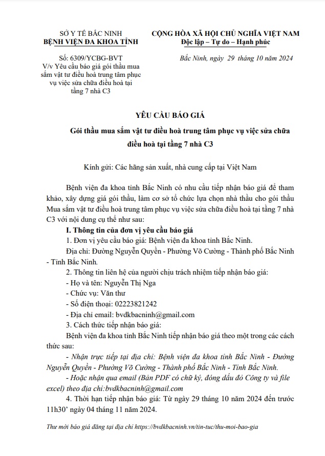Yêu cầu báo giá gói thầu mua sắm vật tư điều hoà trung tâm phục vụ việc sửa chữa điều hoà tại tầng 7 nhà C3
