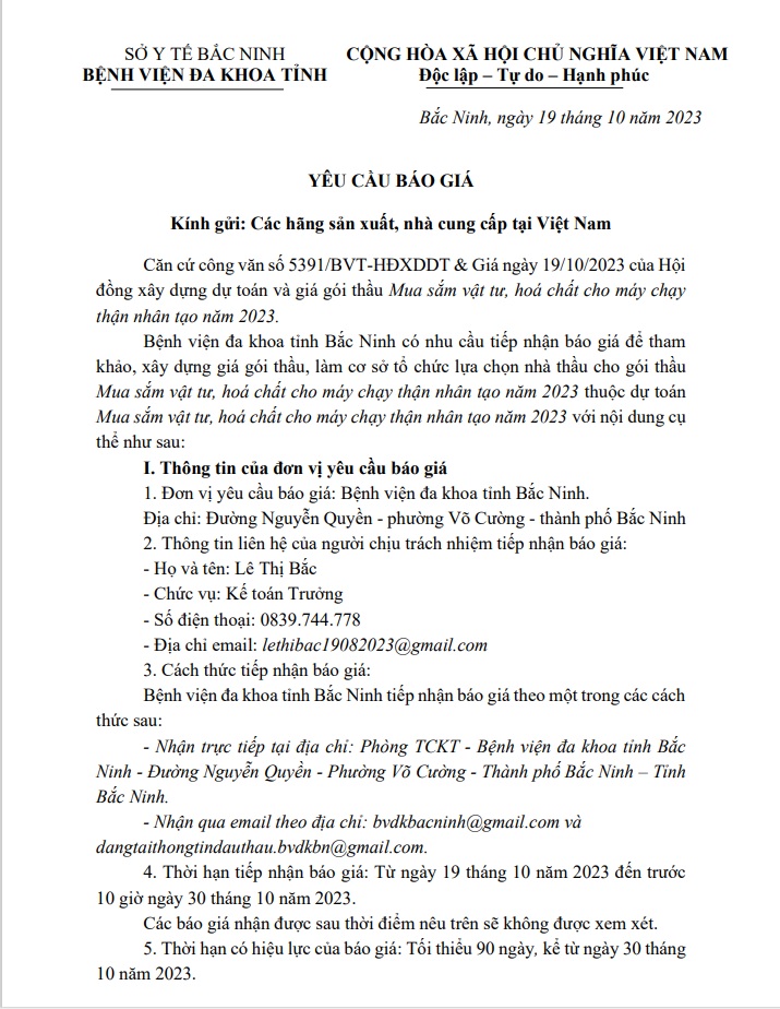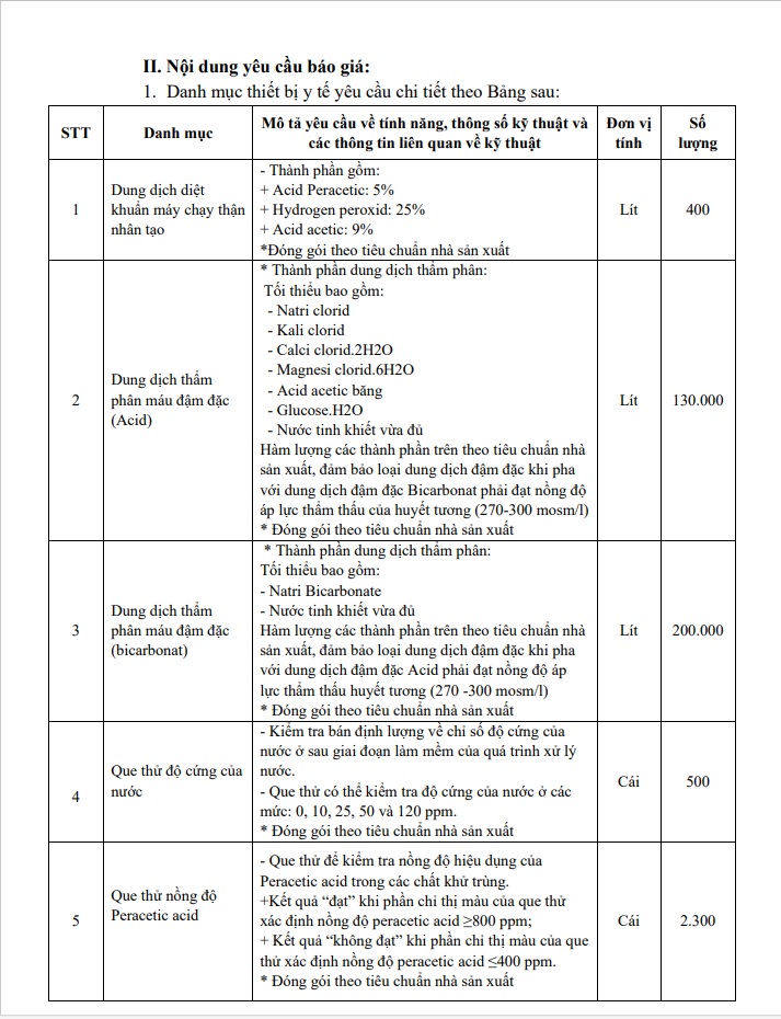 Yêu cầu báo giá gói thầu Mua sắm vật tư, hoá chất cho máy chạy thận nhân tạo năm 2023