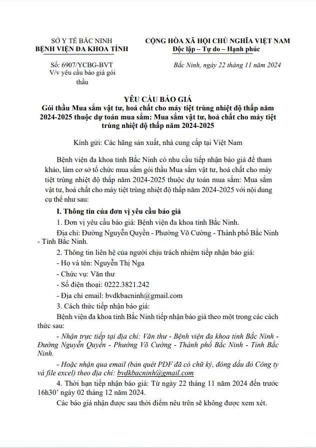 Yêu cầu báo giá Gói thầu Mua sắm vật tư, hoá chất cho máy tiệt trùng nhiệt độ thấp năm 2024-2025 thuộc dự toán mua sắm: Mua sắm vật tư, hoá chất cho máy tiệt trùng nhiệt độ thấp năm 2024-2025