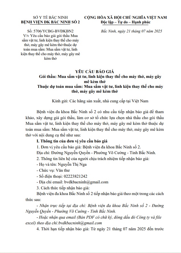 Yêu cầu báo giá gói thầu Mua sắm vật tư, linh kiện thay thế cho máy thở, máy gây mê kèm thở thuộc dự toán mua sắm: Mua sắm vật tư, linh kiện thay thế cho máy thở, máy gây mê kèm thở