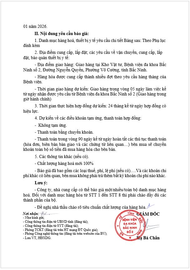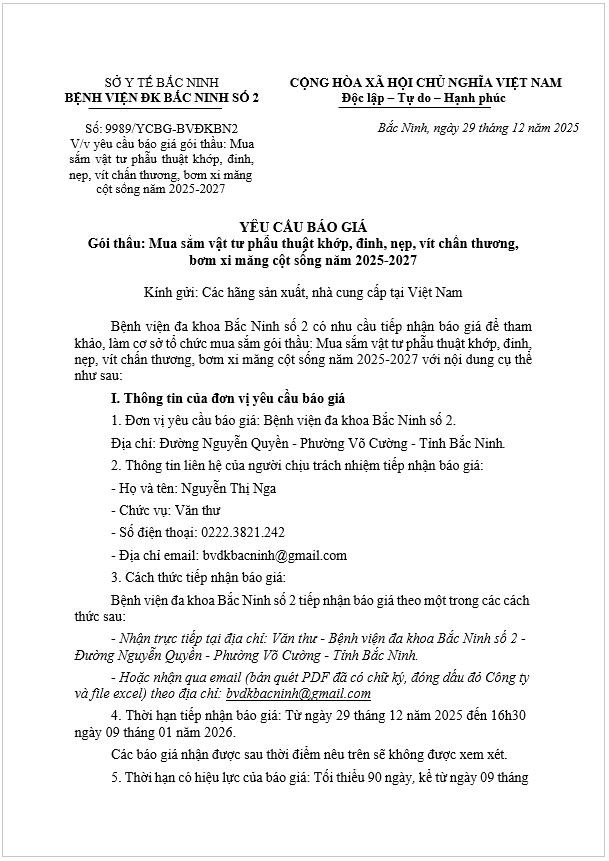 YÊU CẦU BÁO GIÁ Gói thầu: Mua sắm vật tư phẫu thuật khớp, đinh, nẹp, vít chấn thương, bơm xi măng cột sống năm 2025-2027