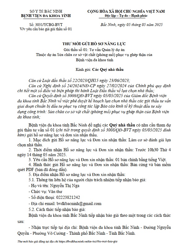 Yêu cầu báo giá gói thầu số 01: Tư vấn Quản lý dự án Thuộc dự án Sửa chữa cơ sở vật chất (phòng mổ) phục vụ ghép thận của Bệnh viện đa khoa tỉnh