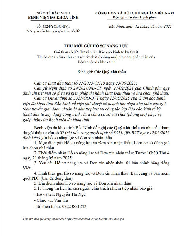 Yêu cầu báo giá gói thầu số 02: Tư vấn lập Báo cáo kinh tes kỹ thuật Thuộc dự án Sửa chữa cơ sở vật chất ( Phòng mổ) phục vụ ghép thận của Bệnh viện đa khoa tỉnh