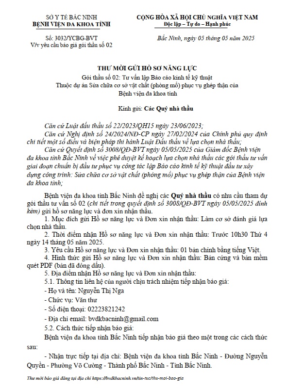 Yêu cầu báo giá gói thầu số 02: Tư vấn lập Báo cáo kinh thế kỹ thuật Thuộc dự án Sửa chữa cơ sở vật chất (phòng mổ) phục vụ ghép thận của Bệnh viện đa khoa tỉnh