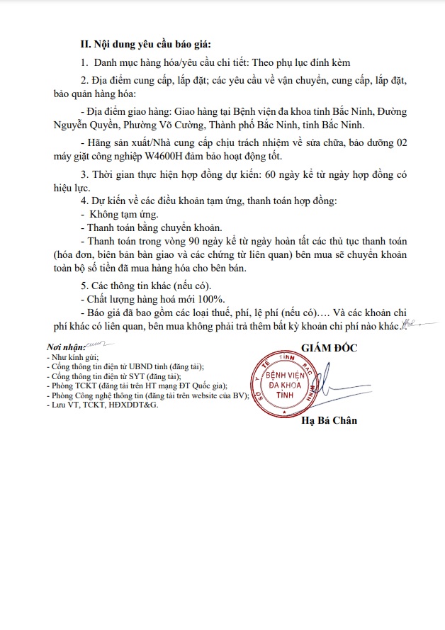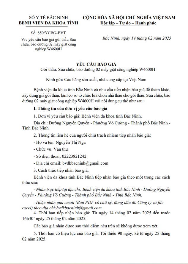 Yêu cầu báo giá Gói thầu: Sửa chữa, bảo dưỡng 02 máy giặt công nghiệp W4600H