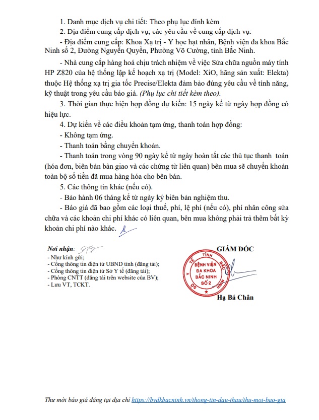 Yêu cầu báo giá gói thầu Sửa chữa hệ thống lập kế hoạch xạ trị thuộc hệ thống xạ trị gia tốc Precise/Elekta
