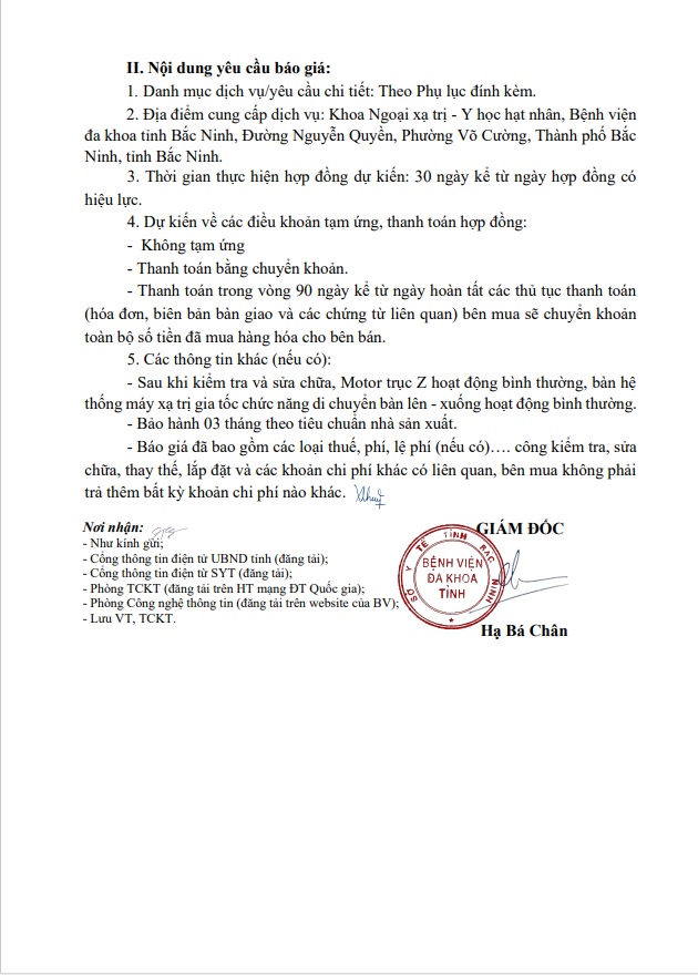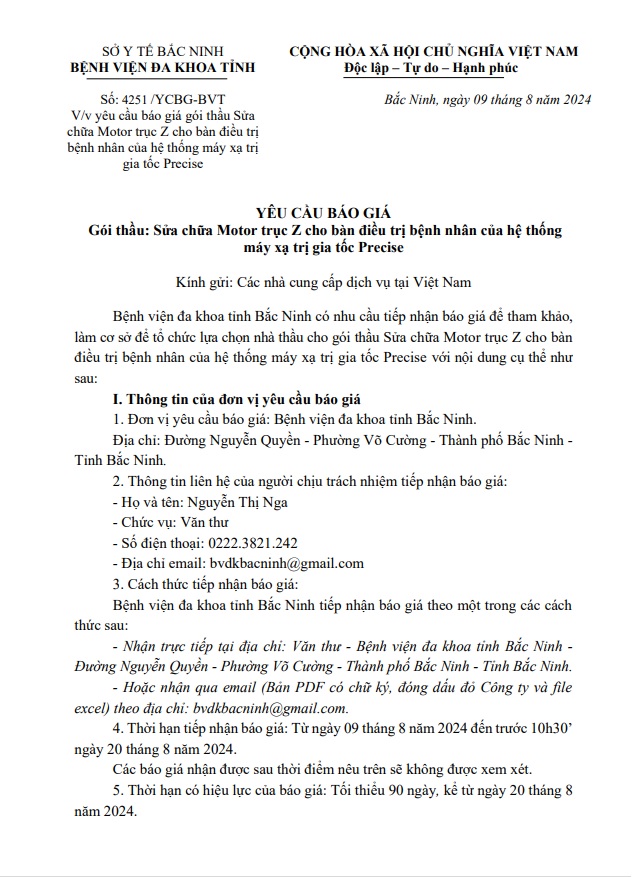 Yêu cầu báo giá gói thầu sửa chữa Motor trục Z cho bàn điều trị bệnh nhân của hệ thống máy xạ trị gia tốc Precise