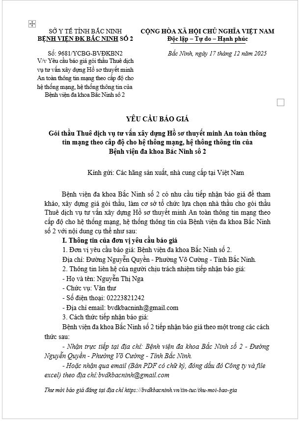 Yêu cầu báo giá gói thầu Thuê dịch vụ tư vấn xây dựng Hồ sơ thuyết minh An toàn thông tin mạng theo cấp độ cho hệ thống mạng, hệ thống thông tin của Bệnh viện đa khoa Bắc Ninh số 2