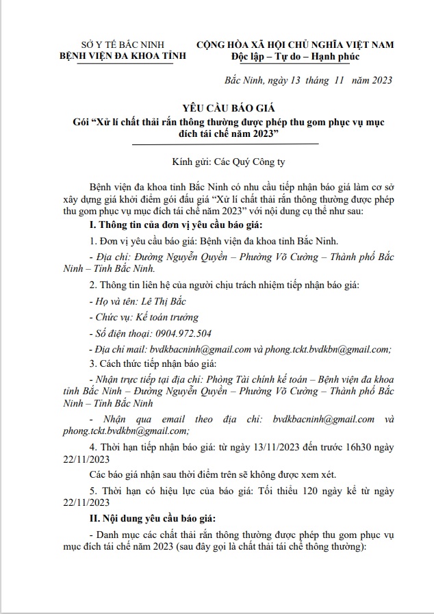 Yêu cầu báo giá Gói "Xử lý chất thải rắn thông thường được phép thu gom phục vụ mục đích tái chế năm 2023