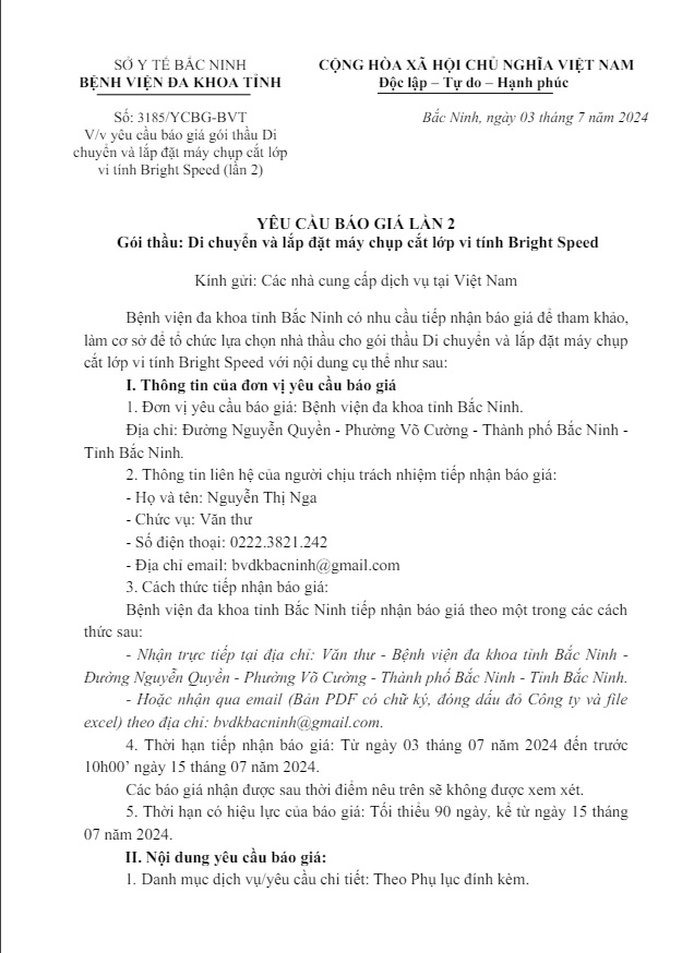 Yêu cầu báo giá lần 2 gói thầu di chuyển và lắp đặt máy chụp cắt lớp vi tính Bright Speed