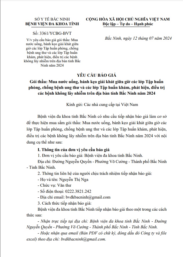 Yêu cầu báo giá: Mua nước uống, bánh kẹo giải khát giữa giờ các lớp Tập huấn phòng, chống bệnh ung thư và các lớp Tập huấn khám, phát hiện, điều trị các bệnh không lây nhiễm trên địa bàn tỉnh Bắc Ninh năm 2024
