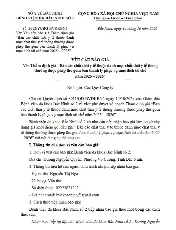 Yêu cầu báo giá Thẩm định giá “Bán các chất thải y tế thuộc danh mục chất thải y tế thông thường được phép thu gom bán thanh lý phục vụ mục đích tái chế năm 2025 – 2026”