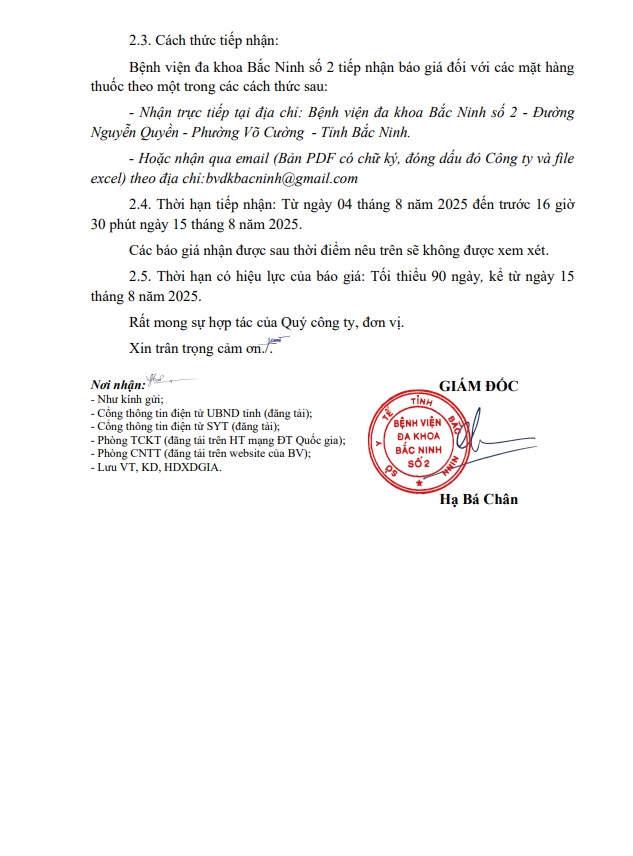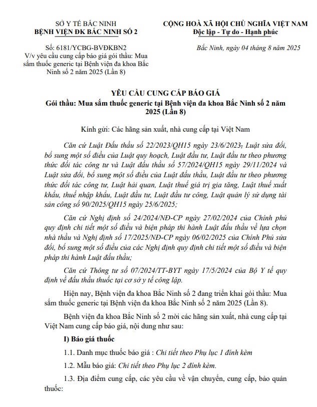 Yêu cầu cung cấp báo giá gói thầu: Mua sắm thuốc generic tại Bệnh viện đa khoa Bắc Ninh số 2 năm 2025 (Lần 8)