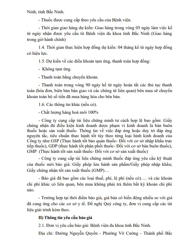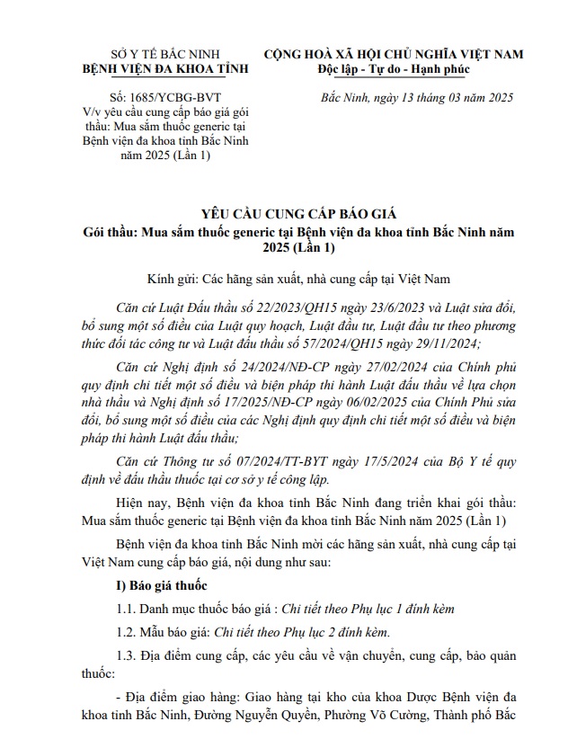 Yêu cầu cung cấp báo giá gói thầu: Mua sắm thuốc generic tại Bệnh viện đa khoa tỉnh Bắc Ninh năm 2025 (Lần 1)