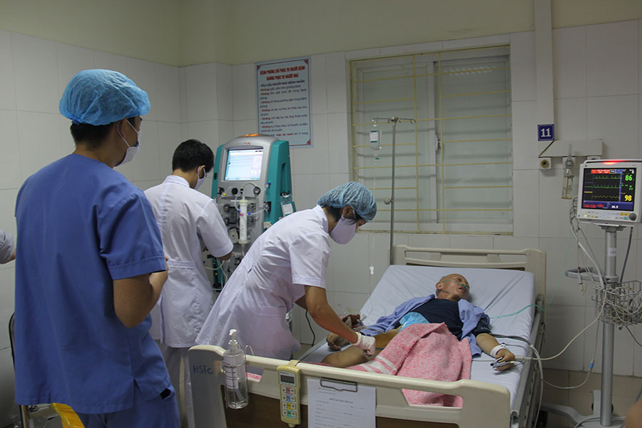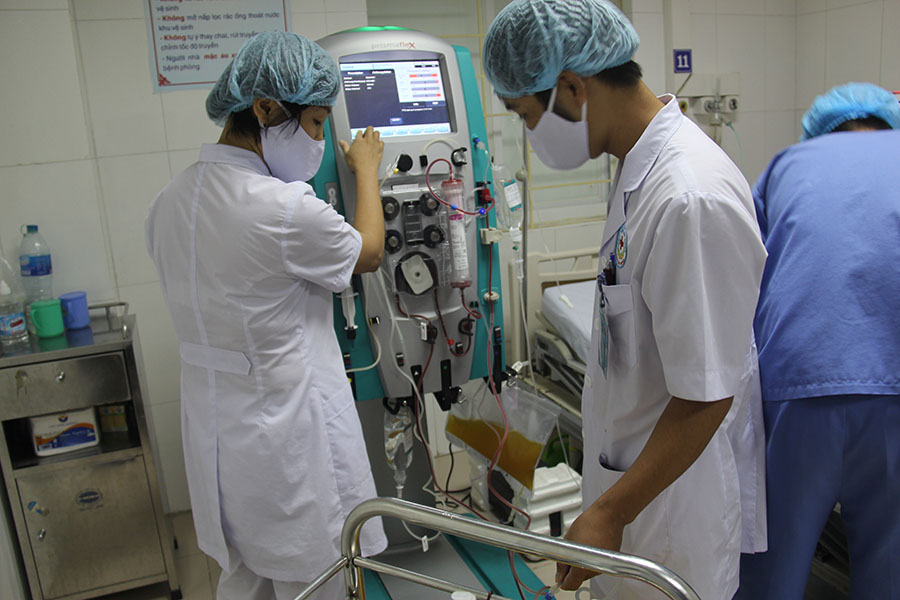 Cán bộ y tế chuẩn bị máy móc trước khi thay huyết tương cho bệnh nhân