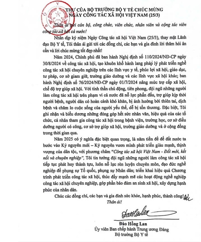 Trong thư, Bộ trưởng Bộ Y tế Đào Hồng Lan bày tỏ: Nhân dịp kỷ niệm Ngày Công tác xã hội Việt Nam thay mặt lãnh đạo Bộ Y tế, Bộ trưởng thân ái gửi tới các đồng chí, các bạn và gia đình lời thăm hỏi ân cần và lời chúc mừng tốt đẹp nhất.