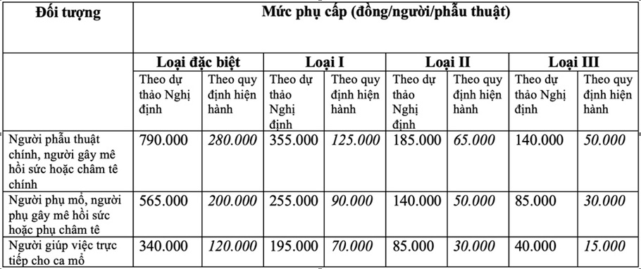 Mức phụ cấp phẫu thuật được đề xuất như sau: