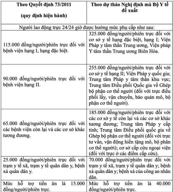 Theo Bộ Y tế, hiện nay các mức phụ cấp gồm phụ cấp trực, phụ cấp phẫu thuật, thủ thuật, phụ cấp chống dịch và mức hỗ trợ tiền ăn đối với công chức, viên chức, người lao động trong các cơ sở y tế công lập được áp dụng theo quy định tại Quyết định 73/2011 của Thủ tướng Chính phủ là quá thấp và không còn phù hợp với tình hình kinh tế, đời sống hiện nay.