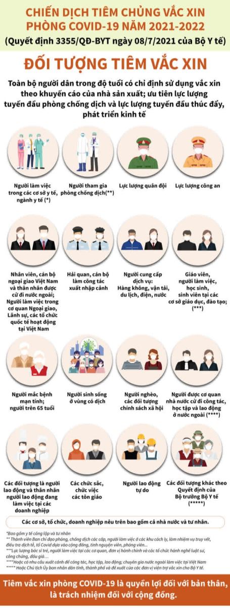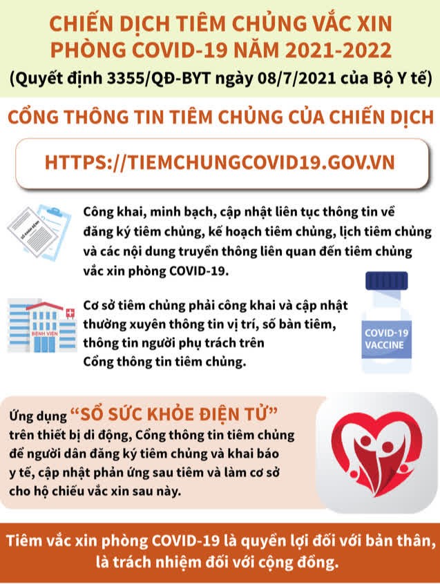 Chiến dịch tiêm vaccine COVID-19 năm 2021-2022 đặt mục tiêu sẽ tiêm 150 triệu mũi vaccine COVID-19 cho hơn 70% dân số Việt Nam từ tháng 7/2021 đến tháng 4/2022. Để tạo điều kiện thuận lợi cho người đi tiêm, Bộ Thông tin- Truyền thông cho ra đời ứng dụng “Sổ sức khỏe điện tử” để những người có nhu cầu tiêm đăng ký online, theo dõi phản ứng và quản lý sức khỏe sau tiêm. Người dân cũng có thể truy cập cổng thông tin tiêm chủng https://tiemchungcovid19.gov.vn để đăng ký tiêm chủng và khai báo y tế, cập nhật phản ứng sau tiêm.