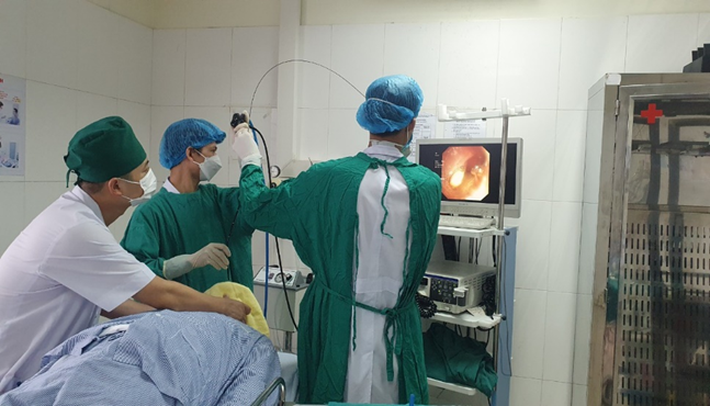 Các y bác sỹ khoa Nội Hô hấp tiến hành nôi soi xử lý dị vật đường thở cho người bệnh