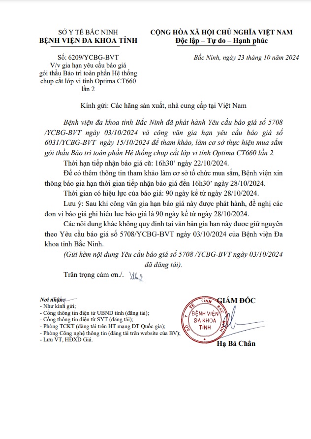 Gia hạn yêu cầu báo giá gói thầu Bảo trì toàn phần Hệ thống chụp cắt lớp vi tính Optima CT660 lần 2