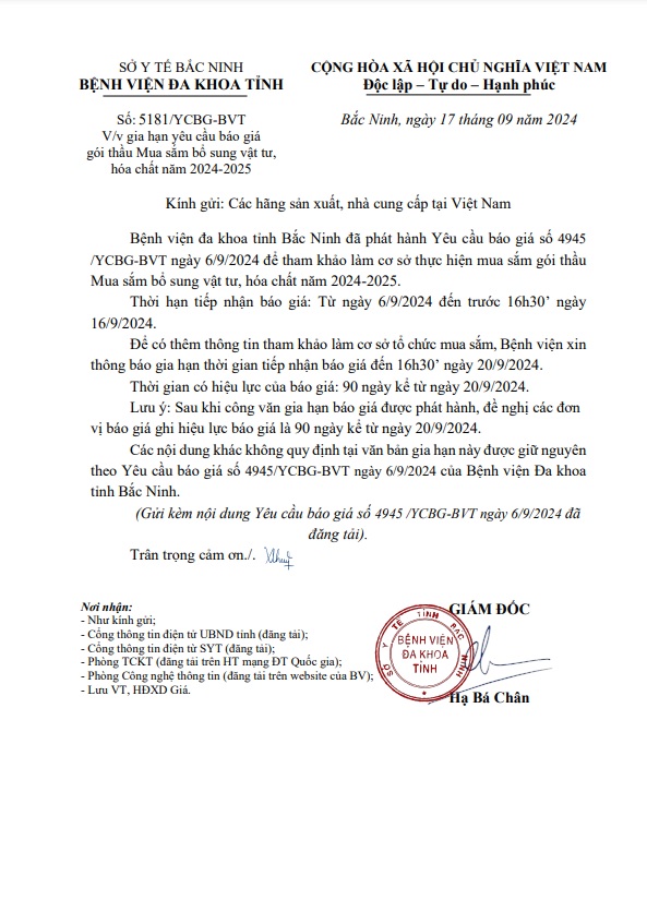 Gia hạn yêu cầu báo giá gói thầu Mua sắm bổ sung vật tư, hoá chất năm 2024-2025