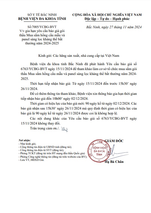 Gia hạn yêu cầu báo giá gói thầu Mua sắm hồng cầu mẫu và panel sàng lọc kháng thể bất thường năm 2024-2025
