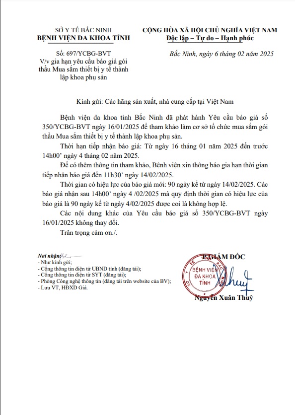 Gia hạn yêu cầu báo giá gói thầu Mua sắm thiết bị y tế thành lập khoa phụ sản