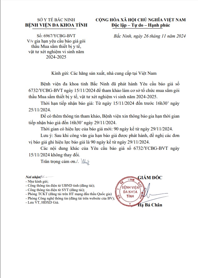 Gia hạn yêu cầu báo giá gói thầu Mua sắm thiết bị y tế, Vật tư xét nghiệm vi sinh năm 2024-2025