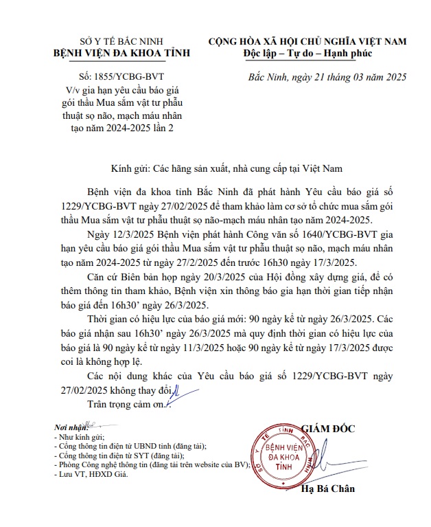 Gia hạn yêu cầu báo giá gói thầu Mua sắm vật tư phẫu thuật sọ não, mạch máu nhân tạo năm 2024-2025 lần 2