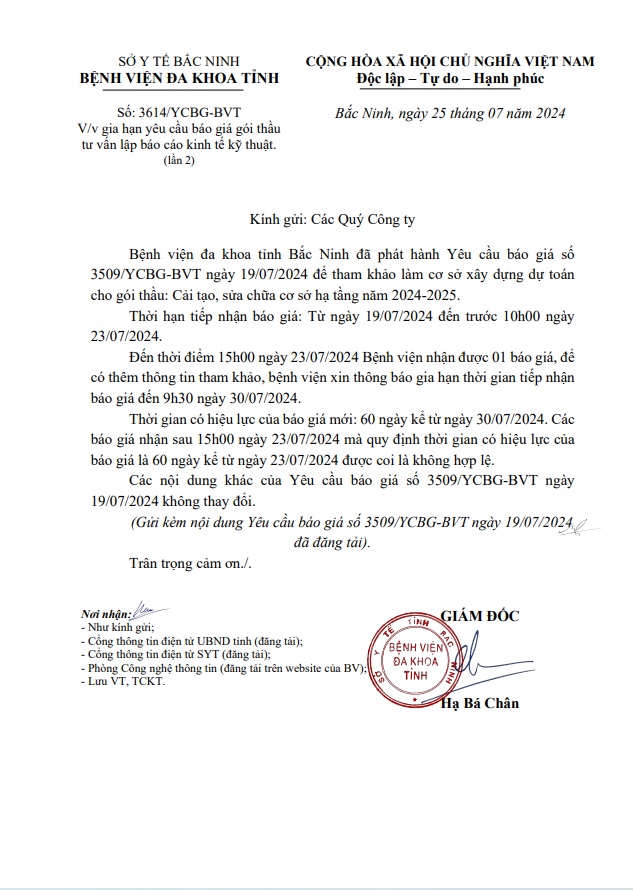 Yêu cầu báo giá gói thầu Thuê dịch vụ chứng thực chữ ký số phục vụ ký số tại Bệnh viện đa khoa Bắc Ninh số 2