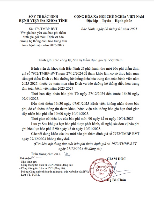 Gia hạn yêu cầu báo phí thẩm định giá gói thầu: Dịch vụ bảo dưỡng hệ thống điều hoà trung tâm toàn bệnh viện năm 2025-2027