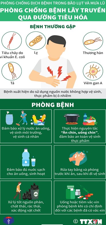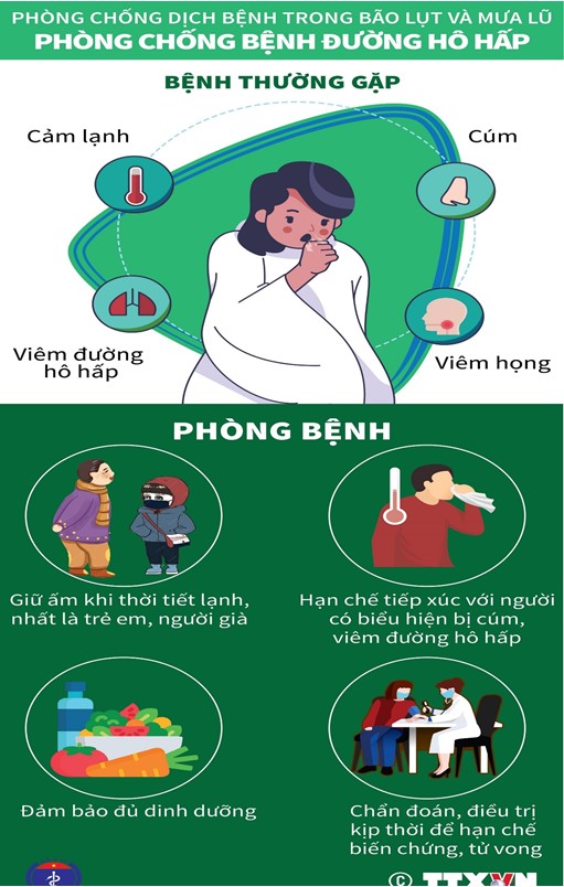Hơn nữa, mưa và ngập lụt là điều kiện thuận lợi để các loại vi khuẩn, vi rút và trung gian truyền bệnh sinh sôi phát triển và gây bệnh cho con người. Những dịch bệnh thường hay gặp trong mùa mưa lũ là: tiêu chảy cấp, bệnh đường hô hấp, bệnh về mắt, bệnh ngoài da, sốt xuất huyết, đặc biệt là nguy cơ của dịch bệnh COVID-19 trong điều kiện bão lũ, thiên tai.