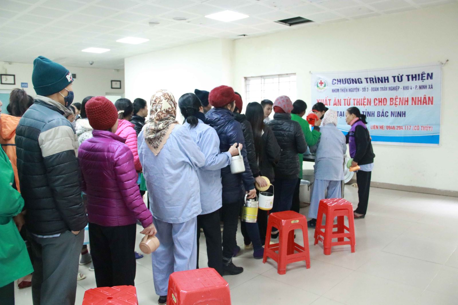 Từ khi thành lập, Tổ Công tác xã hội cùng khoa Dinh dưỡng đã kết hợp với 19 tổ chức, cá nhân từ thiện ủng hộ, định kì hàng tháng thực hiện 20 buổi phát cơm, 31 buổi phát cháo, 1 buổi phát sữa và 1 buổi phát bánh từ thiện cho bệnh nhân điều trị nội trú tại Trung tâm ung bướu, Trung tâm Tim mạch, khoa Hồi sức tích cực và bệnh nhân chạy thận nhân tạo. Tính đến tháng 03/2018, các tổ chức đã hỗ trợ xuất ăn định kì cho người bệnh, tổng giá trị ước đạt hơn 1,7 tỉ đồng. Những xuất ăn luôn đảm bảo đầy đủ chất dinh dưỡng, vệ sinh an toàn thực phẩm và được người bệnh đón nhận. Bà Nguyễn Thị T (Xã Tam Giang, huyện Yên Phong, tỉnh Bắc Ninh) đang điều trị ung thư tại Trung tâm Ung bướu cho biết: “Với những bệnh nhân có bệnh nan y như tôi, thời gian nằm viện điều trị rất dài mà nhận được những bữa cơm, bữa cháo miễn phí là điều hết sức ý nghĩa. Nó không chỉ về mặt vật chất, giúp bớt đi một phần kinh phí sinh hoạt mà còn tạo thêm động lực về mặt tinh thần giúp bệnh nhân có niềm tin điều trị bệnh tốt hơn”. Những bệnh nhân xếp hàng dài với ca, cốc, cặp lồng và phiếu xuất ăn trên tay chờ đến lượt nhận cơm, cháo hoặc bánh mì…từ các tổ chức từ thiện đã trở nên quen thuộc tại Bệnh viện đa khoa tỉnh. Ngày nào cũng vậy, mỗi buổi sáng – trưa – chiều đều có rất đông bệnh nhân hoặc người nhà bệnh nhân có hoàn cảnh khó khăn đến khu vực phát xuất ăn miễn phí thuộc tòa nhà C3 của Bệnh viện.