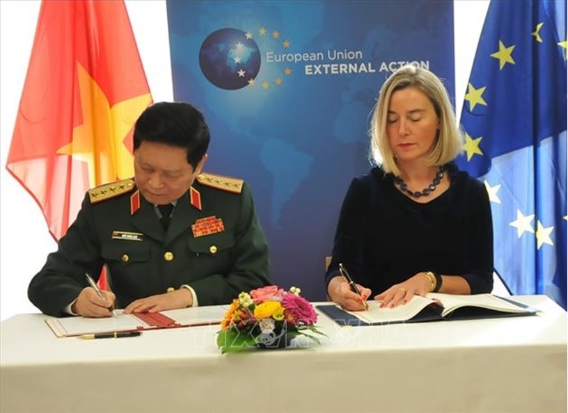 | Đại tướng, Bộ trưởng Bộ Quốc phòng Ngô Xuân Lịch và bà Federica Mogherini, Phó Chủ tịch Ủy ban châu Âu ký Hiệp định FPA. |