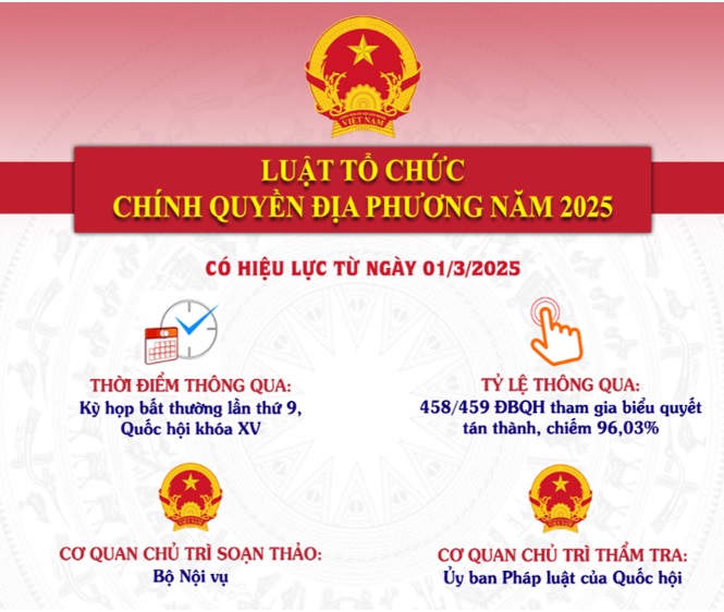 Tại kỳ họp bất thường lần thứ 9 vừa qua, Quốc hội khóa XV đã thông qua Luật Tổ chức chính quyền địa phương với 458/459 đại biểu có mặt biểu quyết tán thành, chiếm 96,03% tổng số đại biểu Quốc hội. Luật có hiệu lực thi hành từ ngày 01/03/2025.