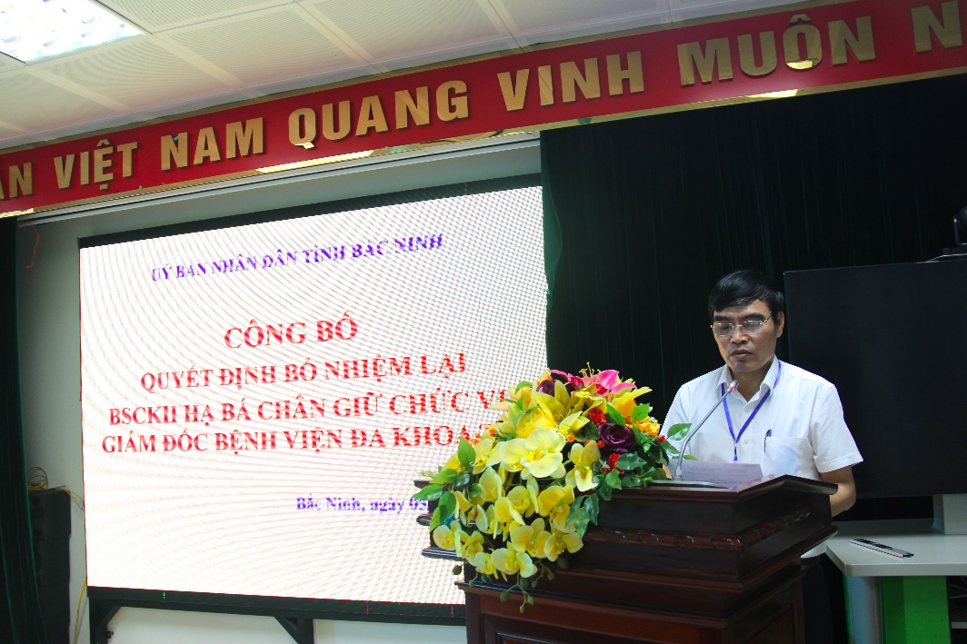 Ngày 06/5/2020, tại Bệnh viện đa khoa tỉnh Bắc Ninh tổ chức công bố Quyết định bổ nhiệm lại Giám đốc Bệnh viện đa khoa tỉnh Bắc Ninh cho ông Hạ Bá Chân tiếp tục giữ chức vụ Giám đốc Bệnh viện đa khoa tỉnh. Dự Hội nghị có các đồng chí Sở Nội Vụ, lãnh đạo Sở Y tế, các đồng chí trong Ban chấp hành Đảng ủy, Ban Giám đốc, Trưởng các khoa/phòng/Trung tâm của Bệnh viện đa khoa tỉnh Bắc Ninh.Thay mặt lãnh đạo Sở Nội vụ, ông Trần Trung Chính – Phó Giám đốc Sở Nội vụ phát biểu chúc mừng ông Hạ Bá Chân - Giám đốc Bệnh viện đa khoa tỉnh Bắc Ninh. Phát biểu nhận nhiệm vụ, ông Hạ Bá Chân trân trọng cảm ơn sự quan tâm giúp đỡ của Sở Nội Vụ, Sở Y tế, Ban Giám đốc, Trưởng các khoa/phòng/Trung tâm và cán bộ nhân viên Bệnh viện đa khoa tỉnh Bắc Ninh. Trước niềm vinh dự và trọng trách lớn lao, đồng chí hứa sẽ cố gắng phấn đấu với tinh thần trách nhiệm, nhiệt tình, hoàn thành tốt mọi nhiệm vụ được giao.