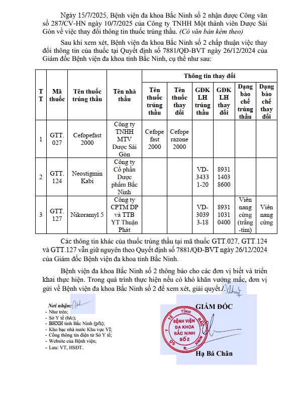 Thay đổi thông tin thuốc trúng thầu Neostigmin kabi, Nikorramyl 5, Cefopeffast 2000