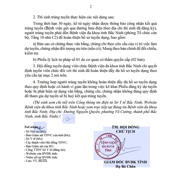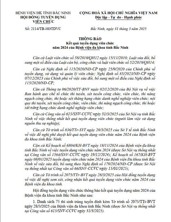 THÔNG BÁO KẾT QUẢ TUYỂN DỤNG VIÊN CHỨC NĂM 2024 CỦA BỆNH VIỆN ĐA KHOA TỈNH BẮC NINH