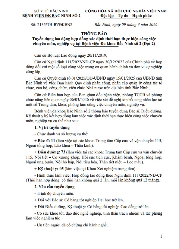 THÔNG BÁO TUYỂN DỤNG LAO ĐỘNG HỢP ĐỒNG XÁC ĐỊNH THỜI HẠN THỰC HIỆN CÔNG VIỆC CHUYÊN MÔN, NGHIỆP VỤ TẠI BỆNH VIỆN ĐA KHOA BẮC NINH SỐ 2 ( ĐỢT 2)