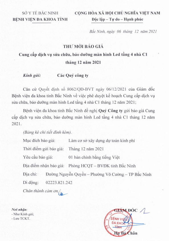 Thư mời báo giá Cung cấp dịch vụ sửa chữa, bảo dưỡng màn hình Led tầng 4 nhà C1 tháng 12 năm 2021