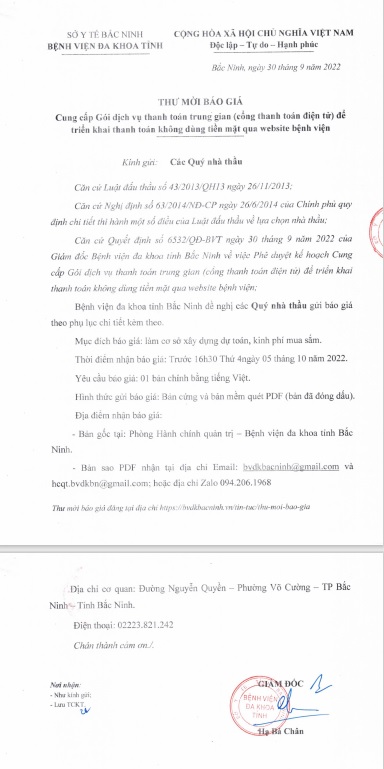 THƯ MỜI BÁO GIÁ Cung cấp Gói dịch vụ thanh toán trung gian ( cổng thanh toán điện tử) để triển khai thanh toán không dùng tiền mặt qua website bệnh viện