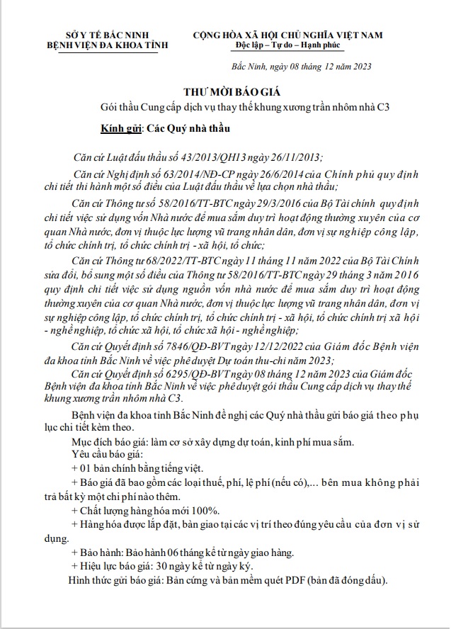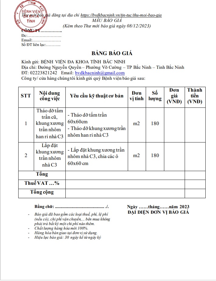 Thư mời báo giá Gói thầu Cung cấp dịch vụ thay thế khung xương trần nhôm nhà C3