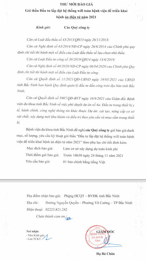 Thư mời báo giá Gói thầu Đầu tư lắp đặt hệ thống wifi toàn bệnh viện để triển khai bệnh án điện tử năm 2021