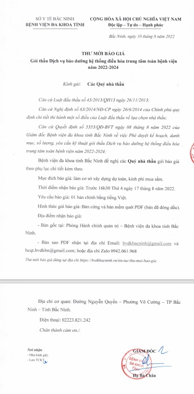 THƯ MỜI BÁO GIÁ Gói thầu Dịch vụ bảo dưỡng hệ thống điều hoà trung tâm toàn Bệnh viện năm 2022-2024