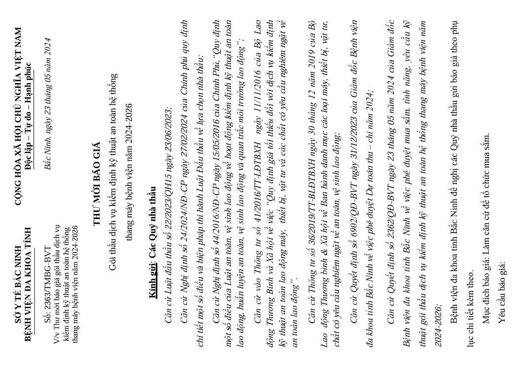Thư mời báo giá Gói thầu dịch vụ kiểm định kỹ thuật an toàn hệ thống thang máy bệnh viện năm 2024-2026