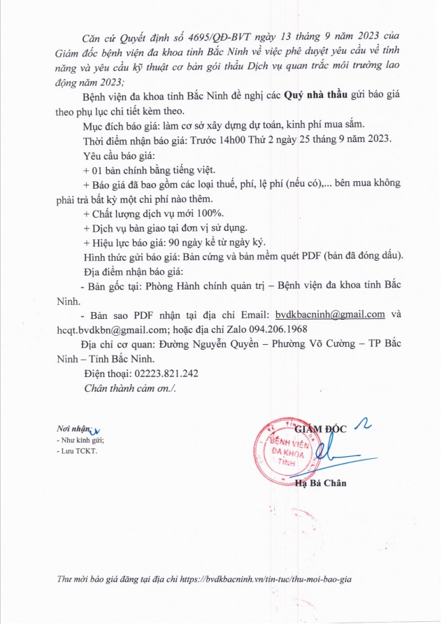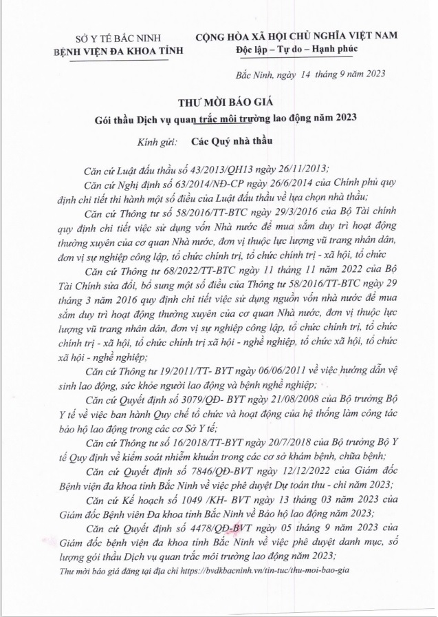 Thư mời báo giá Gói thầu Dịch vụ quan trắc môi trường lao động năm 2023